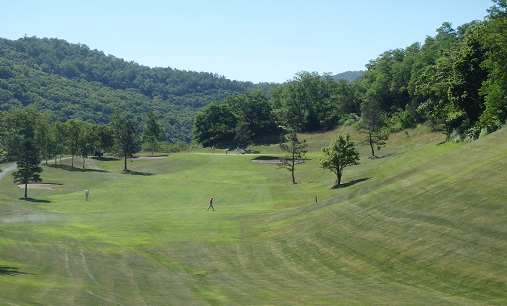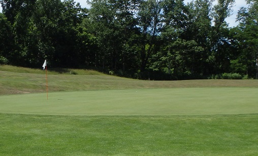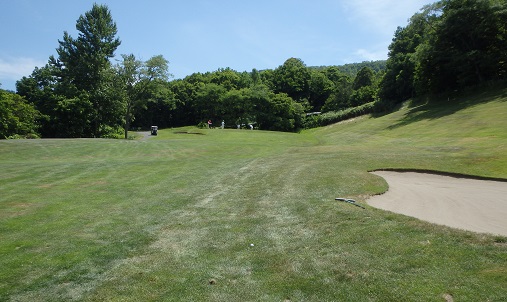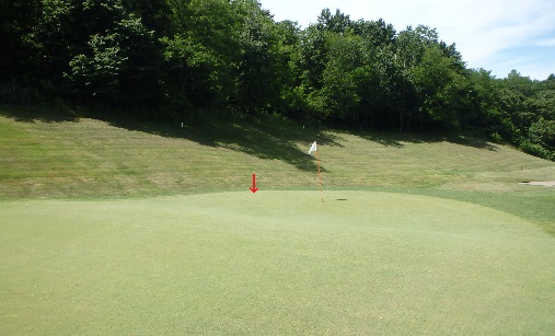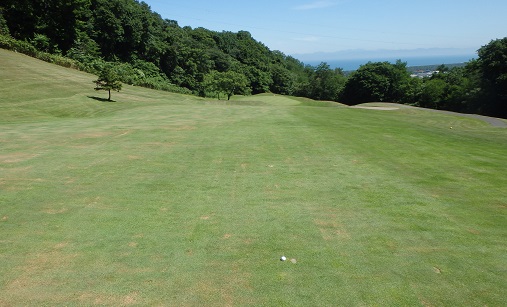 グリーンに向かって急激な左足下がりにボールが止まるようラフを深くしてある。