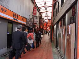 繁華街の中を通勤客が急ぎ足です・・
