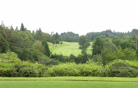 フェアウェーは真ん中の木々を超えたところから左にドックレック