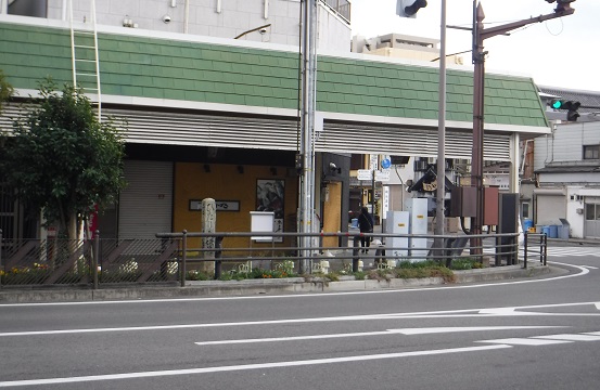 交差点の向こう側に石碑が・・