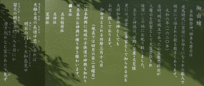 元和六年(1620年)当時、明石城主であった小笠原忠政公が人麿公を歌聖として大変崇敬され、縁深いこの地にお祀り致しました。