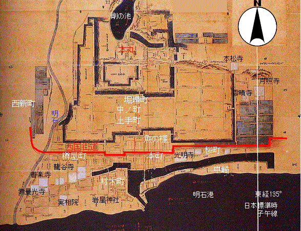 当時の明石城は今の国道2号線を取り込んでしまっています。